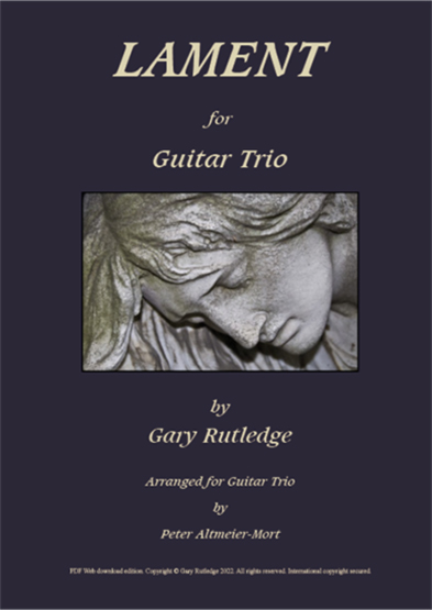Suitable for concert performance, this trio arrangement of "Lament for Guitar Solo" offers a strong slower alternative between more energetic pieces. Attention should be given to achieving a delicate performance whilst maintaining the strong legato phrases.