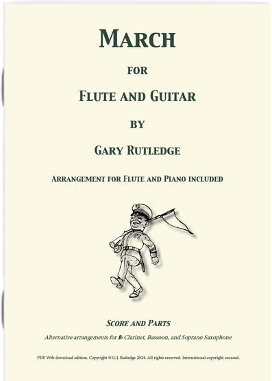 “March for Flute and Guitar” is a quirky and eccentric piece; and is from a collection of five works for flute and guitar titled “Happenstance”. There is also an arrangement for Flute and Piano; and as well as the flute part, versions have been written for: Bb Clarinet, Bassoon and Soprano Saxophone. This work is suitable for players of intermediate and above level.