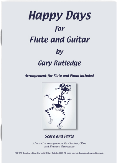 “Happy Days for Flute and Guitar” is a lyrical piece; and is from a collection of five works for flute and guitar titled “Happenstance”. There is also an arrangement for Flute and Piano; and as well as the flute part, versions have been written for: Bb Clarinet, Oboe, and Soprano Saxophone. This work is suitable for players of intermediate and above level.